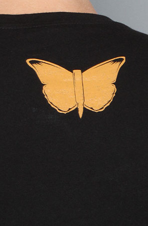 V neck tee with screen print on front and logo screen print on back; 100% ringspun cotton.